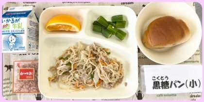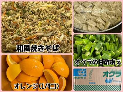 今日の献立は、和風焼きそば・オクラの甘酢あえ・オレンジ・黒糖パン(1/2)・牛乳でした。