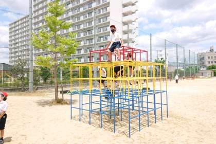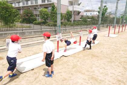 体育科の時間は、運動場で、うんてい、ジャングルジム、鉄棒などのいろいろな遊具を使って、基礎的な体力を身につける運動をしました。