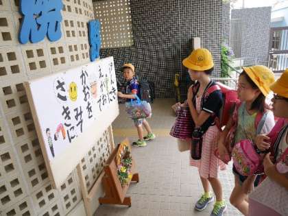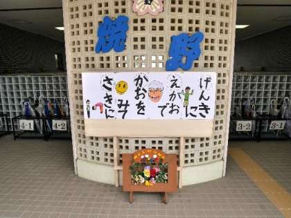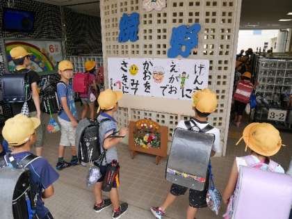 代表委員会がつくってくれた挨拶の呪文は「先に、かおを見て、笑顔で、元気よく」ですね。管理作業員さんが玄関に掲示板を作ってくれました。そこに掲示されています。あいさつの呪文をしっかりできたかな。