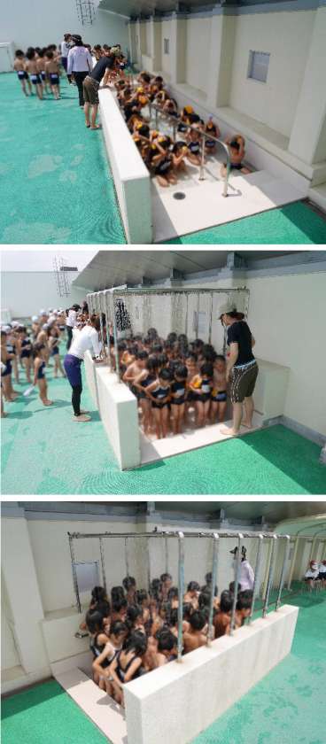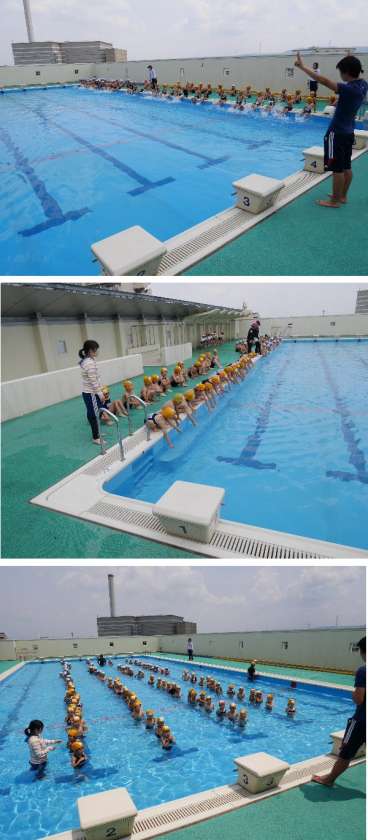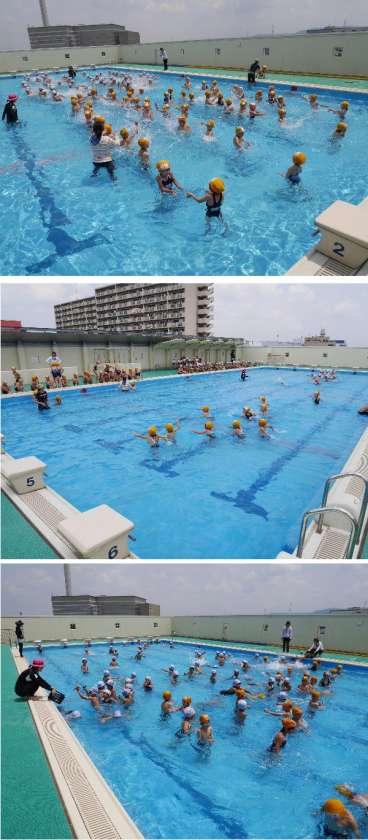 1・2年生の初めての水泳の授業です。1年生にとっては初めてのプールですね。シャワーでも少しびっくりしていたね。顔をつけたり、ふし浮きで泳いだり、どんどん水になれていきます。少し苦手な子もいていますが、だんだん慣れてくのと楽しいプールになるからがんばろうね。