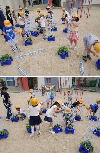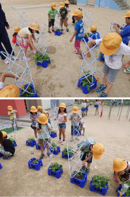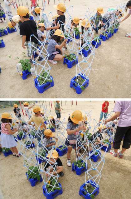 1年生ではアサガオを育てています。毎日の水やりを通してアサガオを育て観察しています。今日は大きくなってツルが伸びてきたアサガオのために支柱をたてました。