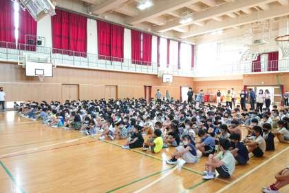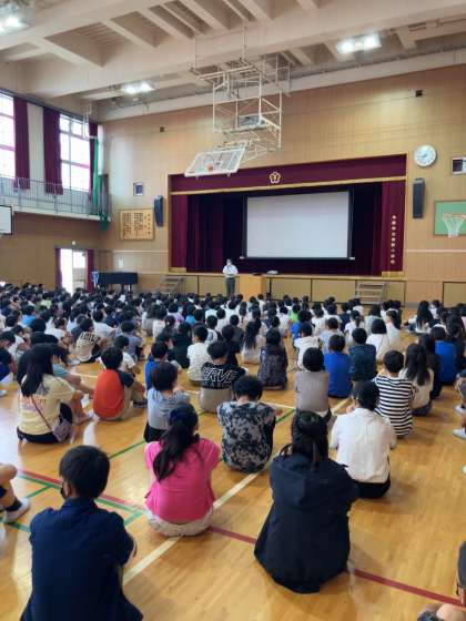 これまで、コロナ対策でオンラインの朝会を続けていましたが、約3年ぶりに全校児童が講堂に集まって児童朝会を行いました。