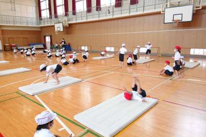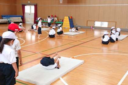 体育科の時間は、マットの上で、いろいろな回り方を練習しました。