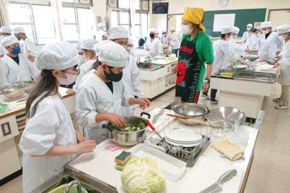 家庭科の時間は、「ゆで野菜サラダ」の調理実習を行いました。
