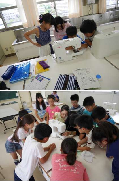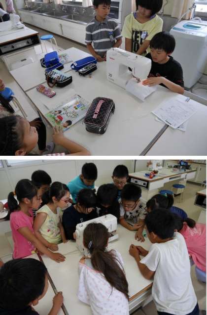 5年生がミシンの使い方を実習しています。糸をつけずにから縫いしてミシンの操作に慣れてから、糸のつけ方を教えてもらっています。