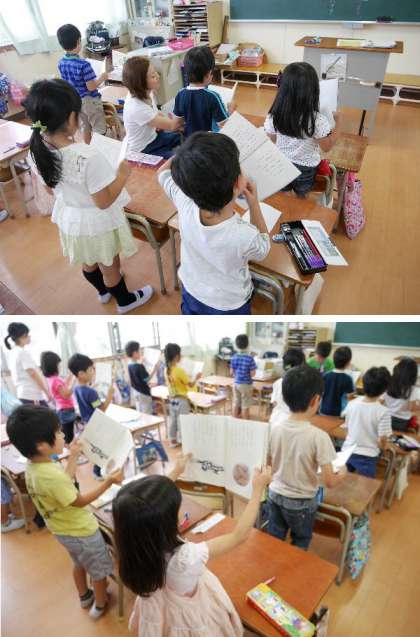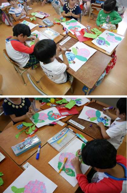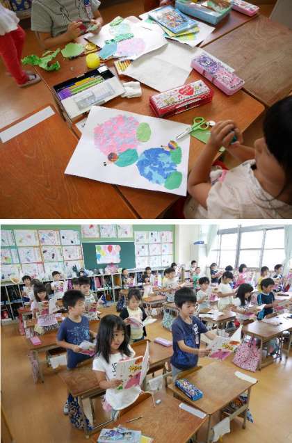 1年生ではずっと作ってきたアジサイの絵が完成間近ですね。工夫された絵がとてもあざやかでいいですね。国語の本読みでは意味を考えながらしっかり声がでていましたね。