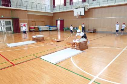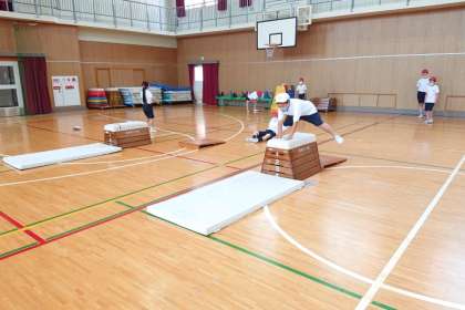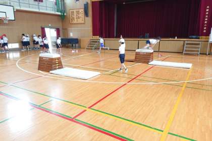 とび箱の前の方に手をついて、正面を見てとびこすことがポイントです。