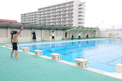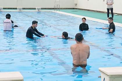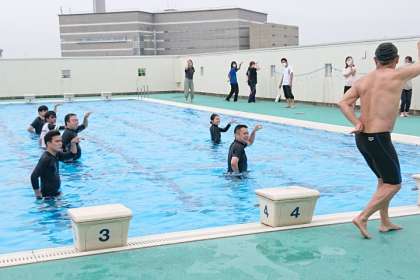 本校の教員が、準備運動や水慣れ、けのびなど水泳の基本的な指導技術を具体的に学びました。
