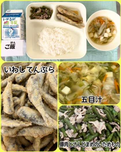 今日の献立は、いわしてんぷら・五目汁・豚肉とさんどまめのいためもの・ごはん・牛乳でした。