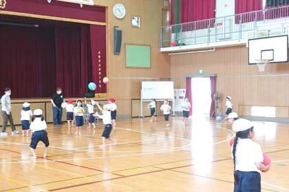 ボールを上に投げて、落ちてくる間に手をたたいたり、回転したりしてボールをキャッチする練習をしました。
