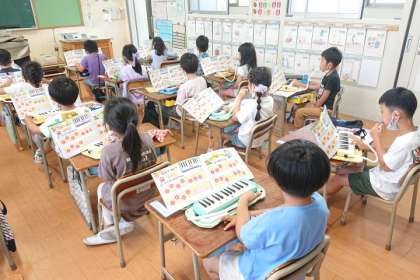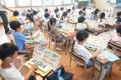 続いて、鍵盤ハーモニカの「ド」と「レ」の音を使って、「やまびこさん」の曲を練習しました。