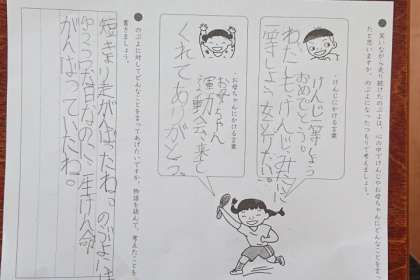 今日は、最後の場面で笑いながら走り続けた主人公の「のぶよ」が心の中で「けんじ」や「お母ちゃん」にどんなことを言ったのか、「のぶよ」になったつもりで考えました。
