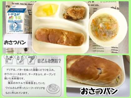 今日の献立は、カレードリア・豚肉とキャベツのスープ・りんご(カット缶)・おさつパン・牛乳でした。