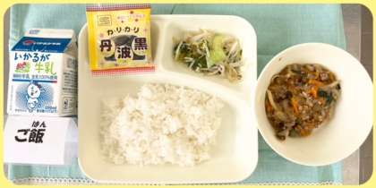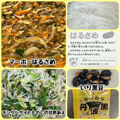 今日の献立は、マーボーはるさめ・チンゲンサイともやしの甘酢あえ・いり黒豆・ごはん・牛乳でした。