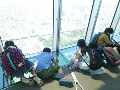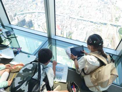 展望台から見えた建物や道路、鉄道、山や川などをワークシートに記入していきます。