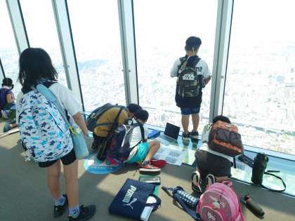 展望台から見えた街のようすはタブレットを使って写真で記録しています。