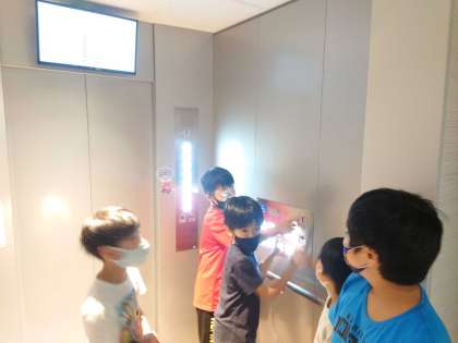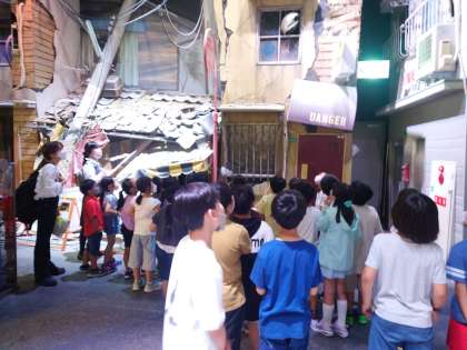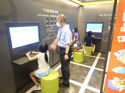 ガイドの方のお話を聞きながら、地震、津波、火災などからどのようにして身を守ればよいのか、体験しながら学習しました。