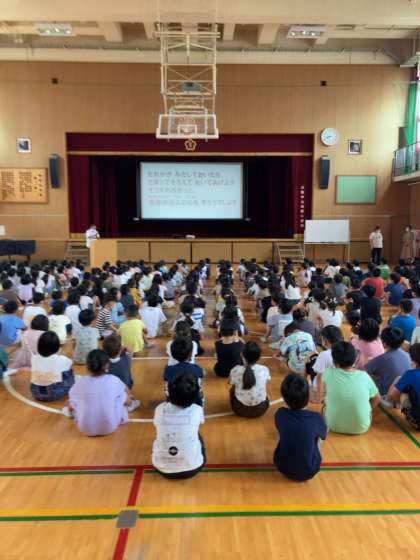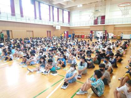 今日の児童朝会は、全学年がそろって講堂で行いました。