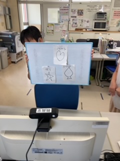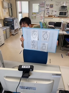 初めにホワイトボードにある形を記憶し、その後、集会委員が1枚取った形を当てる「ミッシングゲーム」を行いました。