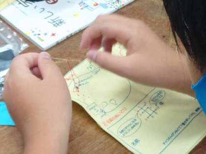 家庭科の時間は、裁縫の玉どめや玉むすびの練習をしました。