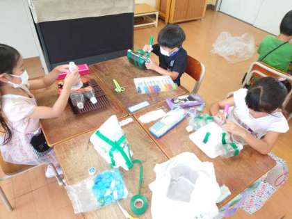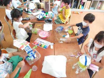 生活科の時間に、ペットボトルや食品トレイなどの廃材を使って、「水にうかぶおもちゃ」を作っています。