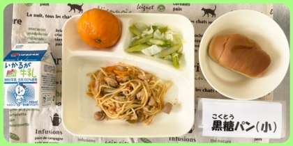 今日の献立は、チキントマトスパゲッティ・グリーンアスパラガスとキャベツのサラダ・みかん(冷)・黒糖パン(1/2)・牛乳でした。