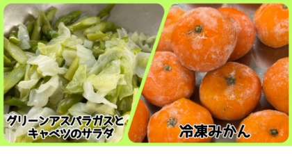 サラダは、焼き物機で蒸したグリーンアスパラガスとキャベツを、砂糖・塩・ワインビネガー・サラダ油で作ったドレッシングであえます。