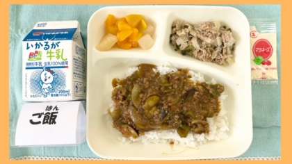 今日の献立は、夏野菜のキーマカレーライス・ゴーヤとツナのマヨネーズ風味・ミックスフルーツ(缶)・牛乳でした。