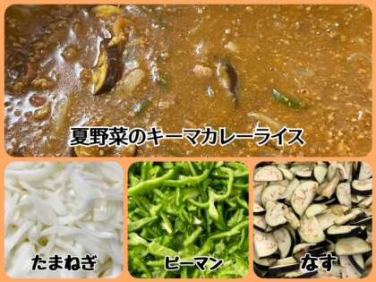 キーマカレーライスは、牛ひき肉・豚ひき肉と夏野菜のなすやピーマンなどを使用しています。
