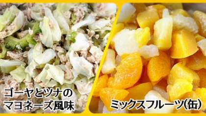 ゴーヤとツナのマヨネーズ風味は、にがうりをツナ・キャベツと組み合わせていため、小袋のマヨネーズをかけていただきます。