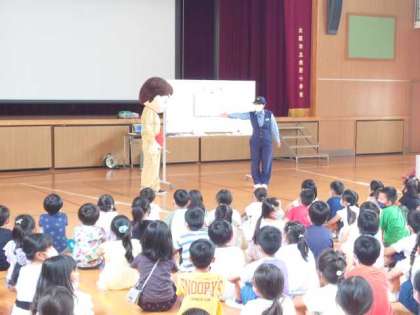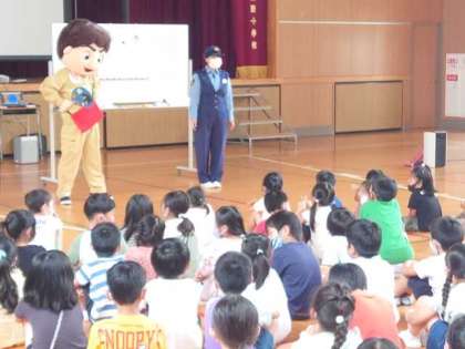 犯人役のキャラクターが登場し、おまわりさんとのかけ合いを通して、子どもたちが事件や事故に巻き込まれないようにするためにどんなことが大切か具体的に教えていただきました。