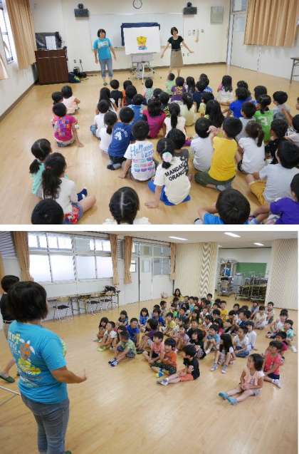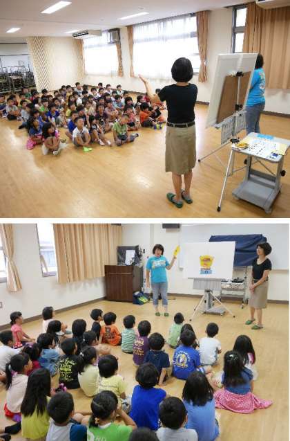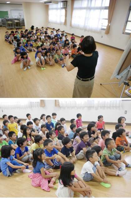 今日の1年生の読み聞かせは、多目的室でのパネルシアターでした。図書ボランティアさんが、歌を一緒に歌って盛り上げてくれました。子どもたちもとても楽しそうに、お話に集中していました。