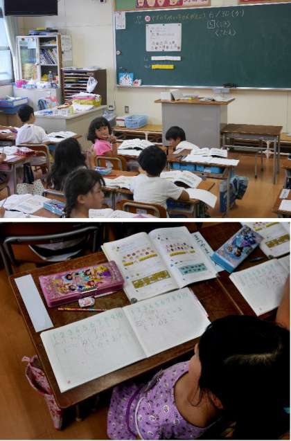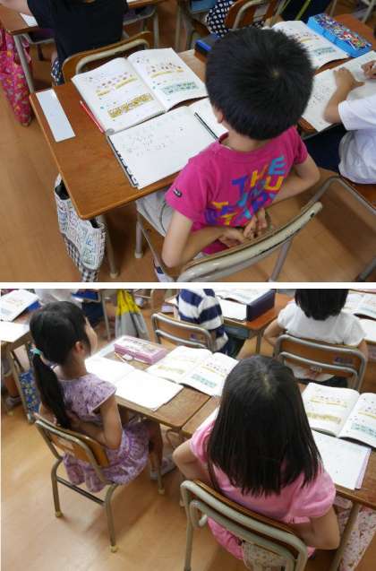 1年生の算数では、「かずのちがいを考えよう」を学習しています。問題をよんで答えをひき算の式で答えます。計算でけでなく、文書を読み取る力が必要ですね。式と答えを書いた人は、先生のチェックをうけるために、いい姿勢をして静かに待っています。