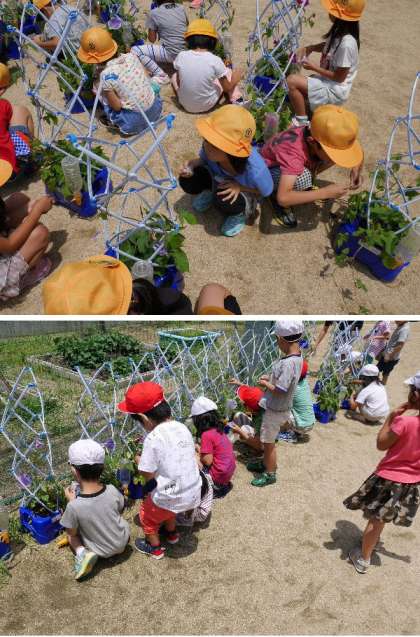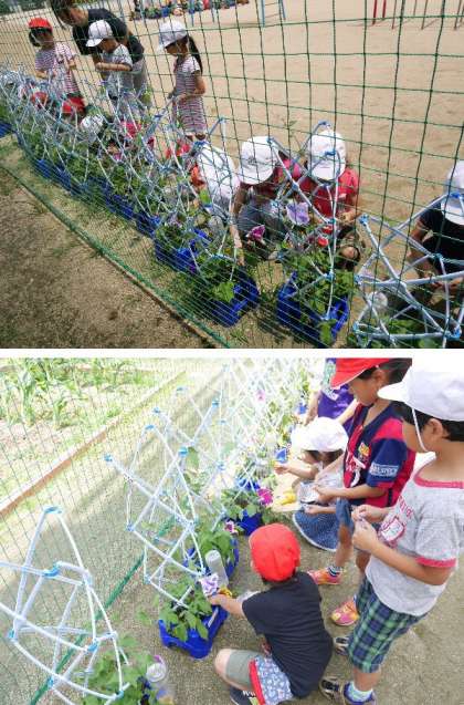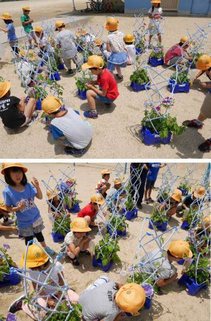 1年生が育ってきたアサガオに追肥をしています。もっとたくさんきれいな花が咲くといいですね。