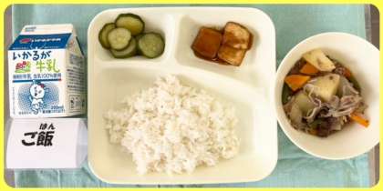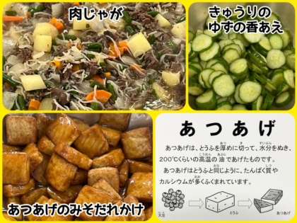 今日の献立は、肉じゃが・あつあげのみそだれかけ・きゅうりのゆずの香あえ・ごはん・牛乳でした。