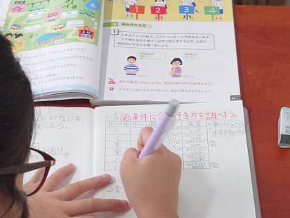 いちばん安い行き方、かかる時間がいちばん短い行き方、600円以下で行く行き方、北駅を1時30分に出発して体育館に2時30分までに着く行き方など、さまざまな条件に合った行き方について、図などを使って調べました。