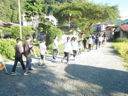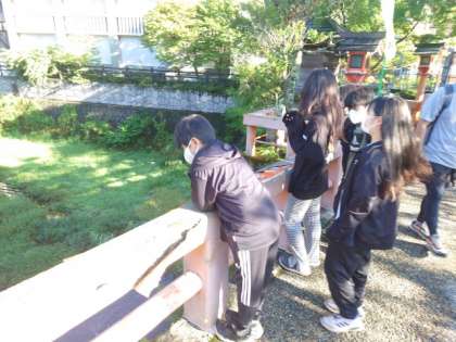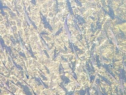 朝の会の帰り道、橋の上から川をのぞくと、ニジマスがたくさん泳いでいました。