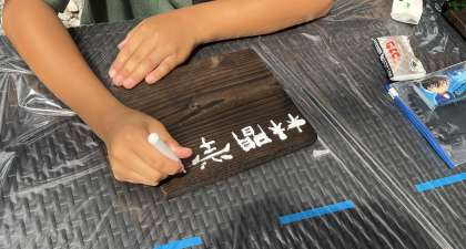 焼き板に絵付けをしています。