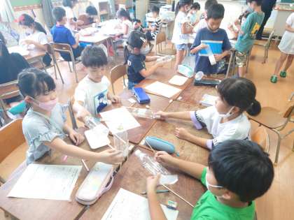 ペットボトルにわりばしをつけ、トレーではねを作って輪ゴムで取り付けます。