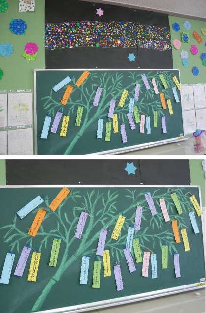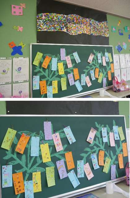 先日、みんなで作った天の川の下の黒板に、七夕の短冊を書いてはりました。短冊には、「ケーキやさんになりたい」「オリンピックにでたい」「モデルになりたい」などの将来の夢や、「走るが早くなりたい」「プールでうかべるように」と現実的な希望を書いている子もいます。目標をしっかりつくってがんばりましょう。