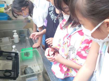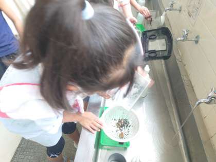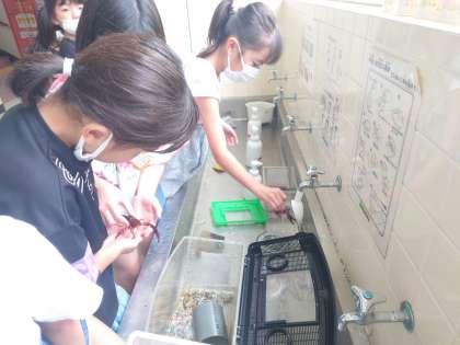 休み時間、2年生の子どもたちが一生懸命ザリガニのお世話をしています。
