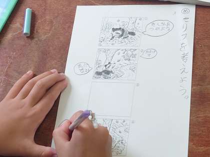 国語科の時間は、たぬきとねずみが出てくる絵を見て、想像したことから物語の設定やせりふを考えました。