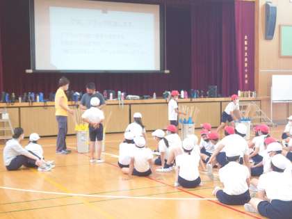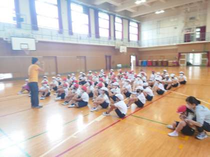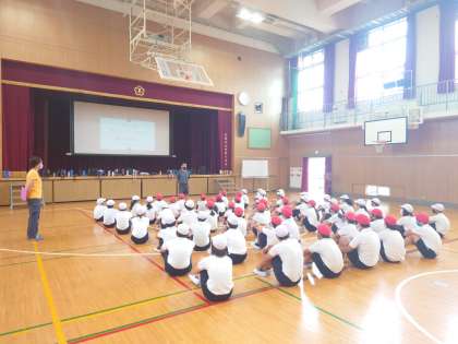 運動会の団体演技の練習を始めるにあたって、どんな演技をするのか、どんな心構えが大切かなどについて担任から子どもたちに話をしました。