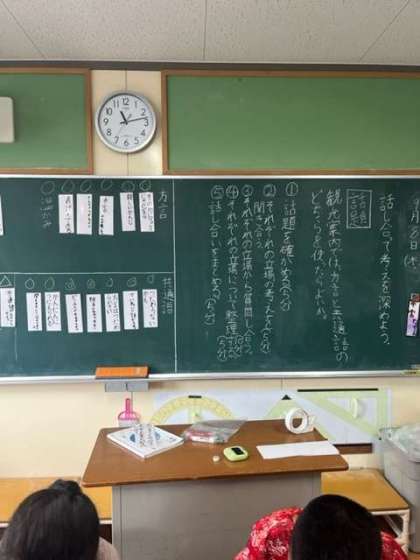 国語科の時間は、「観光案内では、方言と共通語のどちらを使うほうがよいか」という話題について、2つの立場に分かれ、話し合いをしました。