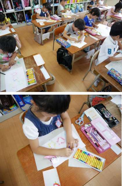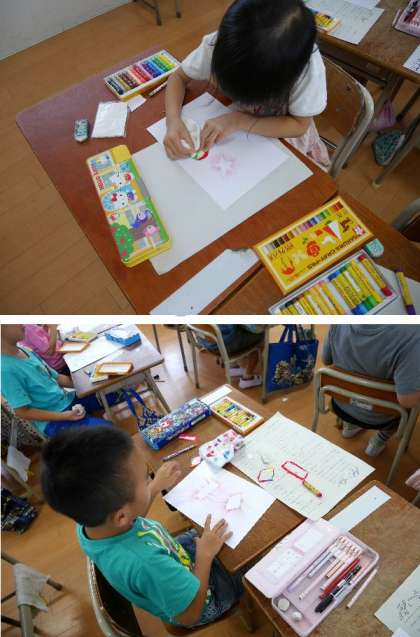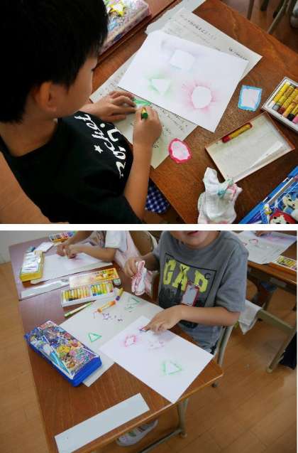 画用紙を星形やハート型に切り抜いて。クレパスをぬって、新しい画用紙の上において布でこすると、型紙のかたちがいろんな色でうつりました。虹色にしている子もいますね。どんな作品が出来上がるかな?