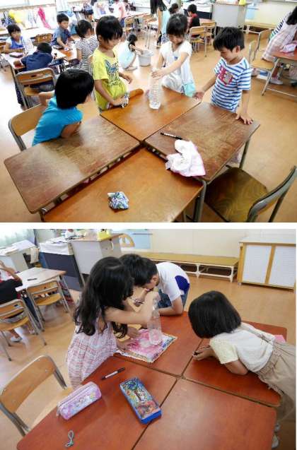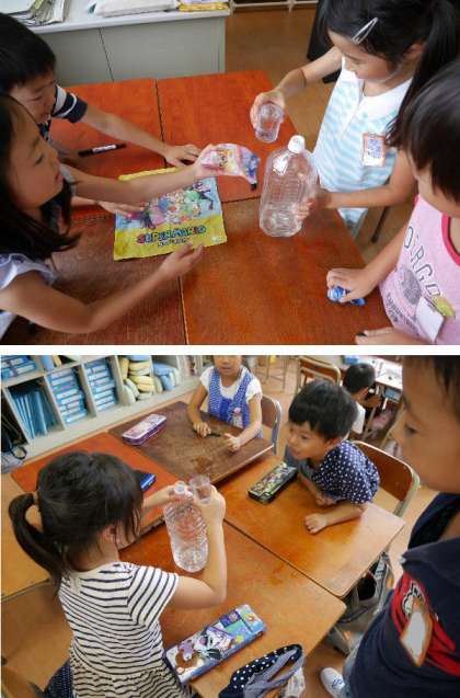2年算数では1dlを測ってペットボトルにどれだけ入るか調べています。上手に水が入れるのはむずかしいね。こぼれちゃうよ。