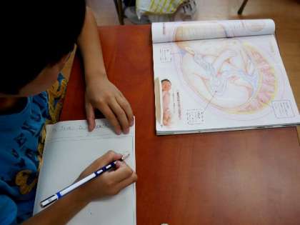 5年生の理科では「ヒトのたんじょう」について学習しています。受精卵や母親の子宮の中の様子を学習しています。子どもたちが教科書から、おなかの中の赤ちゃんの様子の絵を写してまとめています。