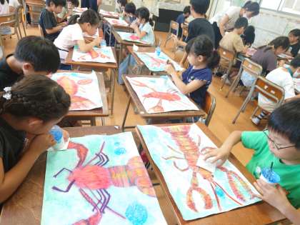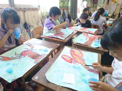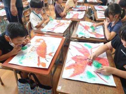 図工科の時間は、これまでに描いたザリガニの絵に、バブルペインティングで色を着けています。