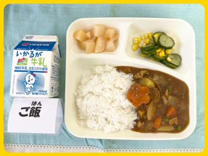 今日の献立は、チキンカレーライス[米粉]・きゅうりとコーンのサラダ・白桃(カット缶)・牛乳でした。