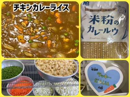チキンカレーライスは、鶏肉を主材にした毎回好評な献立です。小麦アレルギーの児童に配慮して「米粉のカレールウの素」を使用しています。給食室ではラッキーにんじんを作っていただきました。